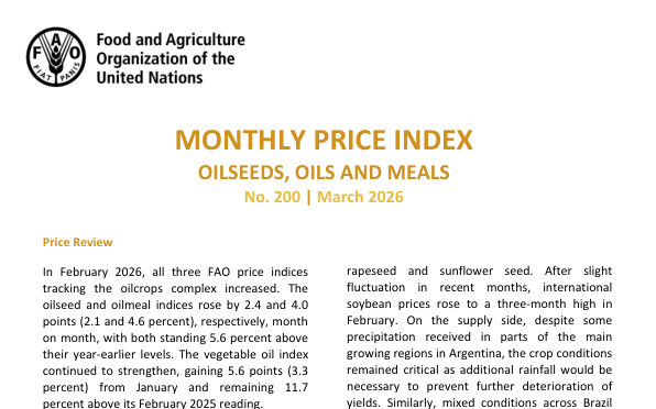 In February 2026, all three FAO price indices for oilseeds, oils, and meals increased. The oilseed and oilmeal indices rose by 2.1% and 4.6% month on month, respectively, standing 5.6% above their year-earlier levels. The vegetable oil index increased by 3.3% from January and was 11.7% above its level in February 2025. Price increases were driven by higher quotations for soybeans, rapeseed, and sunflower seed. Soybean prices reached a three-month high due to critical crop conditions in Argentina and Brazil, and strong demand for biofuel feedstocks in the USA. Rapeseed prices rose due to expected import demand from China following easing trade tensions. Sunflower seed prices increased due to global supply tightness despite a record harvest in Argentina. Soymeal prices increased driven by higher soybean prices and crushing activity in Brazil and the USA, despite seasonal declines in Argentina.