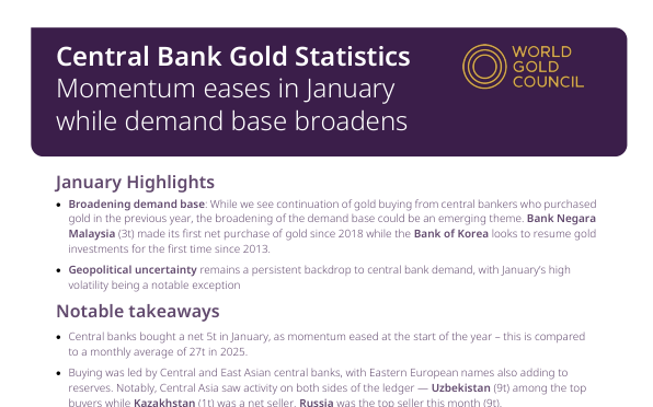 Central banks bought a net 5 tonnes of gold in January 2026, a slowdown compared to the monthly average of 27 tonnes in 2025. The demand base for gold is broadening with new buyers such as Bank Negara Malaysia and the Bank of Korea resuming purchases. Buying was led by Central and East Asian central banks, with Eastern European banks also adding reserves. Uzbekistan was a top buyer, while Russia was the top seller. Bulgaria’s National Bank sold gold corresponding to an increase in ECB reserves as it joined the EU. Geopolitical uncertainty remains a key driver of gold demand despite some volatility. Overall momentum in gold buying eased but remains intact.