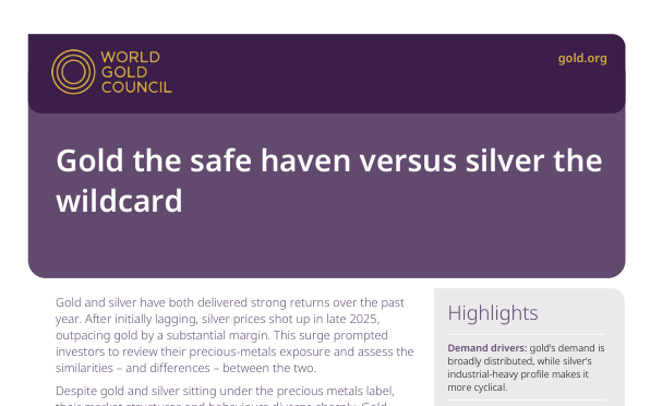 It highlights gold's role as a strategic, defensive asset with balanced demand and lower volatility, while silver is characterized by higher industrial demand, greater volatility, and acts as a high-beta complement in portfolios.