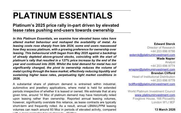 Rising lease costs led end-users to prefer ownership over leasing starting from May 2025, amid already low above-ground platinum stocks and a significant platinum price rally. Total platinum demand remained stable, but reduced metal cycling through leasing decreased liquidity and maintained high lease rates, contributing to tight market conditions in 2026. The report highlights the impact of US import tariff concerns and market deficits on lease rates and the resulting finance-driven shift to ownership that amplified price sensitivity and fueled the price rally.