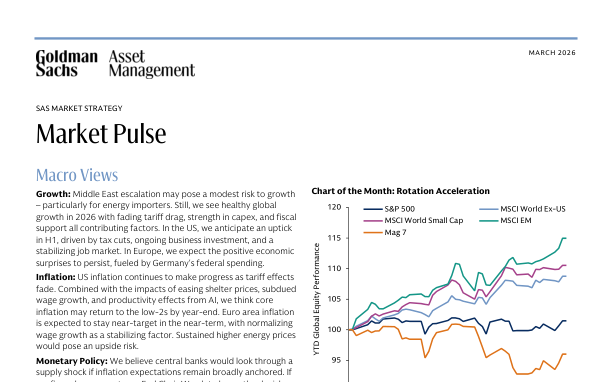 It highlights healthy global growth expected despite risks from Middle East escalation, with growth drivers including fading tariff drag, strong capital expenditure, and fiscal support. US growth is anticipated to pick up in the first half of 2026 due to tax cuts, business investment, and a stabilizing job market. Europe is expected to see positive economic surprises supported by Germany's federal spending. Inflation in the US is making progress with core inflation possibly returning to low-2% by year-end, while Euro area inflation is expected near target with risks from sustained higher energy prices. Central banks are likely to look through supply shocks if inflation expectations remain anchored, with a dovish Fed Chair and possible postponement of BoJ rate hikes. Market views note mixed investor sentiment in the AI sector and strong Emerging Markets equities driven by earnings, global growth, AI hardware demand, and commodity prices.