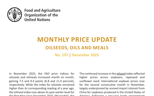 В ноябре 2025 года индексы цен на масличные культуры и шроты выросли по сравнению с предыдущим месяцем на 6,8% и 11,4% соответственно, при этом индекс шротов превысил уровень прошлого года впервые с декабря 2023 года. Цены на растительные масла немного снизились, но остались выше уровня прошлого года. Рост цен был обусловлен повышением цен на сою, рапс и подсолнечник, что связано с возобновлением импортного спроса из Китая, проблемами с поставками в Аргентине, задержками экспорта из Австралии и Украины, а также неопределенностями в регулировании ЕС.