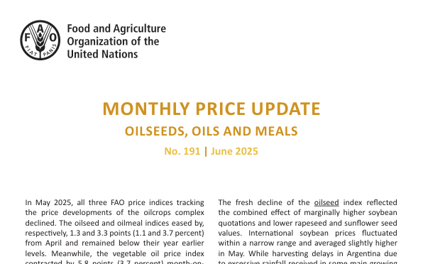В мае 2025 года все три ценовых индекса FAO, отслеживающих изменения цен на масличные культуры, снизились. Индексы цен на масличные культуры и шроты снизились на 1.3 и 3.3 пункта соответственно, оставаясь ниже уровня прошлого года. Индекс цен на растительные масла снизился на 5.8 пункта, но остался на 19.1% выше уровня мая 2024 года. Снижение индекса масличных культур связано с незначительным ростом цен на сою и снижением цен на рапс и подсолнечник. Цены на сою колебались в узком диапазоне и в среднем немного выросли в мае. На снижение цен на рапс повлияли перспективы увеличения производства в ЕС, а на снижение цен на подсолнечник — увеличение посевов и производства в Черноморском регионе.
