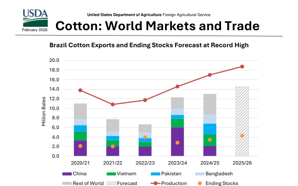 Основные выводы подчеркивают прогноз рекордных экспортных объемов и конечных запасов хлопка в Бразилии на маркетинговый год 2025/26. В отчете рассматриваются направления экспорта, ценовые тенденции и прогнозы на 2026/27 год, при этом ожидается незначительный рост мирового производства и снижение потребления.