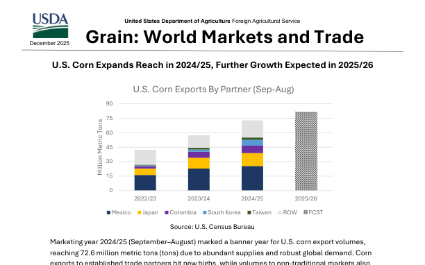 Маркетинговый год 2024/25 стал рекордным для экспорта кукурузы из США, достигнув 72,6 миллиона метрических тонн благодаря обильным запасам и сильному мировому спросу. Экспорт расширился как на традиционные, так и на новые рынки, добавлено 16 новых направлений по сравнению с предыдущим годом. Значительный рост наблюдался в Мексике, Японии, Колумбии, Южной Корее, Центральной Америке, Юго-Восточной Азии, Европейском союзе и Северной Африке. Прогноз на 2025/26 год предполагает дальнейший рост до 81,3 миллиона тонн, поддерживаемый рекордными запасами и высоким спросом. Ранние проверки экспорта показывают рекордные объемы с заметным ростом в нескольких регионах.