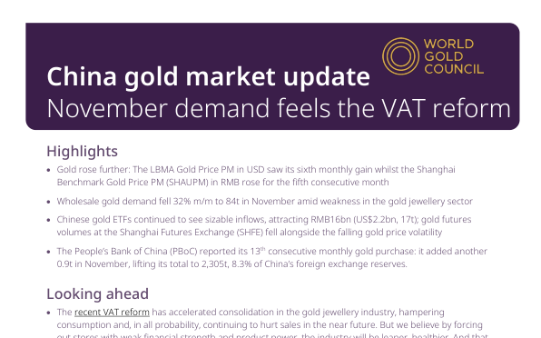 Цены на золото продолжали расти во всем мире, наблюдались значительные притоки в китайские золотые ETF, а оптовый спрос на золото резко снизился, главным образом из-за слабости в секторе ювелирных изделий. Народный банк Китая продолжал закупки золота, а реформа НДС повлияла на потребление ювелирных изделий, но ожидается, что это приведет к консолидации отрасли и более здоровой рыночной динамике со временем.