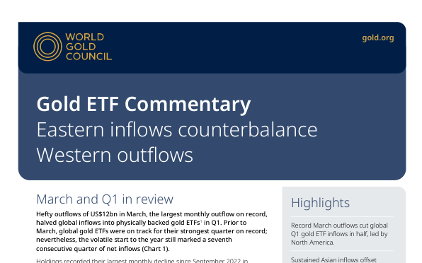 Отчет анализирует потоки и рыночные тенденции биржевых фондов, обеспеченных золотом (ETF), за март 2026 года и первый квартал 2026 года.