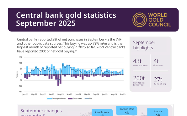 В сентябре центральные банки сообщили о чистых покупках в размере 39 тонн, что на 79% больше по сравнению с предыдущим месяцем и является самым высоким показателем за 2025 год. Центральный банк Бразилии стал крупнейшим покупателем месяца (15 тонн), за ним следуют Национальный банк Казахстана и Банк Гватемалы. Центральный банк Узбекистана был единственным, кто сообщил о продажах. С начала года чистые покупки составили 200 тонн, что немного ниже по сравнению с аналогичным периодом 2024 года (215 тонн). Национальный банк Польши остается крупнейшим чистым покупателем в 2025 году (67 тонн).