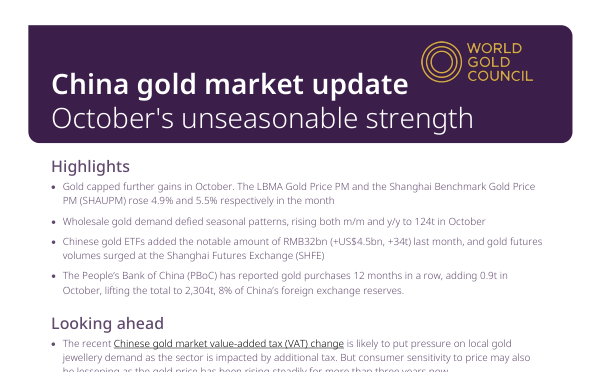 В нем рассматриваются цены на золото, спрос, инвестиционные тенденции и влияние политики, отмечается рост цен на золото, увеличение оптового спроса, значительный приток средств в ETF и продолжающиеся закупки золота Народным банком Китая. В отчете также обсуждаются недавние изменения НДС, влияющие на спрос на ювелирные изделия, и возможные возможности роста продаж золотых слитков.
