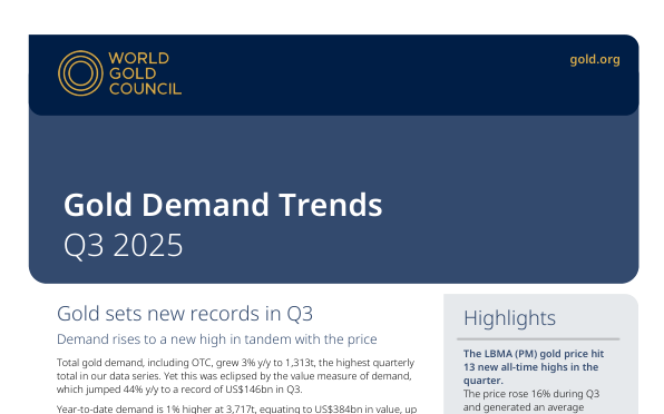 Ключевые выводы включают 3% рост общего спроса на золото, включая внебиржевые операции (OTC), до 1,313 тонн, что является самым высоким квартальным показателем в серии данных. Стоимостная мера спроса выросла на 44% в годовом исчислении до рекордных 146 миллиардов долларов США в третьем квартале. Инвесторы продолжали активно покупать золото, что выразилось в значительном увеличении покупок ETF и спроса на слитки и монеты. Покупки центральных банков оставались на высоком уровне, увеличившись на 28% по сравнению с предыдущим кварталом. Потребление ювелирных изделий снизилось на двузначное число процентов в годовом исчислении, несмотря на увеличение стоимости на 13%. Спрос на золото в технологическом секторе был немного слабее по сравнению с третьим кварталом 2024 года.