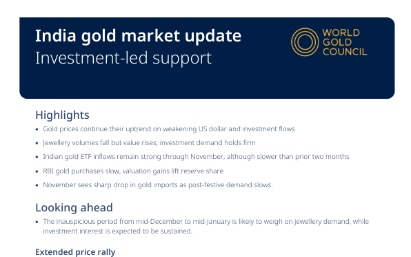 Цены на золото продолжают расти из-за ослабления доллара США и сильного инвестиционного потока. Объемы ювелирного золота снизились по сравнению с прошлым годом, но стоимость увеличилась из-за роста цен. Инвестиционный спрос на золото остается сильным и стабильным. Вливания в индийские золотые ETF сильны, но замедлились по сравнению с предыдущими двумя месяцами. Покупки золота Резервным банком Индии замедлились, но прирост оценки увеличил долю резерва. Импорт золота резко упал в ноябре после снижения спроса после фестивалей. Период с середины декабря по середину января ожидается с более слабым спросом на ювелирные изделия, тогда как инвестиционный интерес, вероятно, сохранится. Внутренние цены на золото превзошли международные, чему способствовало ослабление индийской рупии. Скидки на внутренние цены на золото значительно расширились, отражая замедление спроса на ювелирные изделия. Спрос на ювелирные изделия испытывает давление из-за высоких цен и проблем с доступностью, особенно в сегментах среднего и малого ценового уровня. Спрос на роскошные ювелирные изделия остается сильным, но не компенсирует общий спад объемов. Крупные ювелиры сообщают о более здоровых продажах по сравнению с мелкими и отдельными ювелирами.