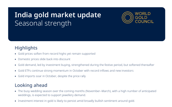 Цены на золото снизились с рекордных максимумов, но остались поддержанными. Внутренние цены на золото вернулись к скидке относительно международных цен. Спрос на золото усилился в праздничный период, главным образом за счет инвестиционных покупок (слитки, монеты), но затем ослабел. Золотые ETF продолжили сильный рост с рекордными притоками и новыми инвесторами. Импорт золота вырос в октябре несмотря на рост цен. Ожидается, что предстоящий сезон свадеб (ноябрь–март) поддержит спрос на ювелирные изделия. Инвестиционный интерес к золоту, вероятно, сохранится на фоне в целом бычьих настроений. Международные цены на золото несколько раз достигали рекордных максимумов в 2025 году с ростом на 58% с начала года. Внутренние цены на золото выросли на 63% с начала года, частично из-за обесценивания индийской рупии. Недавние ценовые движения были обусловлены геополитическими рисками, волатильностью, укреплением доллара США и ожиданиями по процентным ставкам.