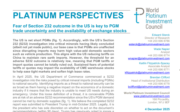 В нем подчеркивается зависимость США от импорта ПГМ из-за ограниченного внутреннего производства, а также анализируются возможные торговые барьеры, риски тарифов и их влияние на доступность рынка и уровни запасов до 2026 года.