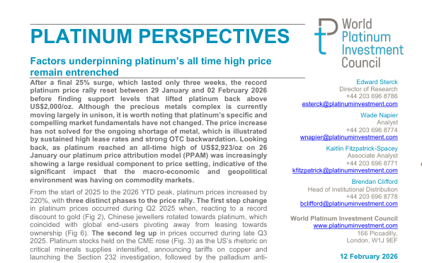 В нем отмечается рекордный рост цен с увеличением на 25% за три недели, достигнув исторического максимума в 2923 доллара США за унцию 26 января 2026 года, а также продолжающийся дефицит платины, подтвержденный высокими ставками аренды и сильным OTC-бэквордацией. В отчете описываются три этапа, повлиявшие на рост с 2025 по 2026 год, обусловленные спросом из Китая, торговой политикой США и геополитическими рисками, а также подчеркивается влияние цен на золото и курса доллара США к южноафриканскому ранду на ценообразование платины.