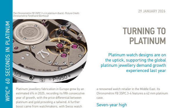 Отмечается рост производства платиновых ювелирных изделий в Европе на 6% в 2025 году, значительное увеличение швейцарской маркировки часов и рост спроса, обусловленный ценовой скидкой платины по сравнению с золотом. В отчете также рассматриваются региональные колебания спроса, включая сильный рост в Китае, снижение спроса в Индии из-за тарифов США и неоднозначные прогнозы на 2026 год.