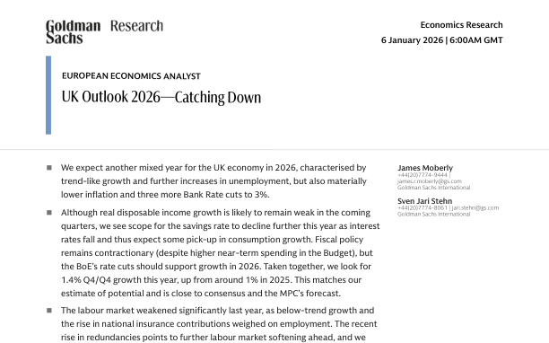 Ожидается смешанный год с трендовым ростом около 1,4% (Q4/Q4), увеличением безработицы до 5,3% к марту и тремя снижениями базовой ставки до 3%. Ожидается значительное снижение инфляции, с падением общей инфляции до 2,1% во втором квартале за счет дефляции в сферах услуг, энергетики и аренды. Рост реальных располагаемых доходов останется слабым, но рост потребления может ускориться по мере снижения сбережений на фоне падения процентных ставок. Фискальная политика остается сдерживающей, несмотря на некоторые краткосрочные увеличения расходов. Состояние рынка труда ухудшается, ожидается замедление роста заработной платы до 3,1% к концу 2026 года. Банк Англии прогнозирует снижение ставок в марте, июне и сентябре. Правительство сосредоточено на структурных реформах, таких как реформы планирования, улучшение торговых отношений с ЕС и повышение участия в рынке труда, несмотря на существующие вызовы.