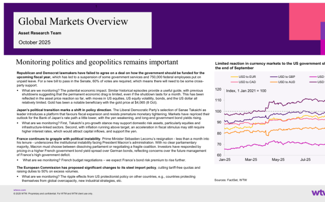 Ключевые выводы включают продолжающуюся политическую нестабильность в США из-за неспособности законодателей договориться о финансировании правительства, что приводит к приостановке некоторых государственных услуг. В Японии происходит политический переход с новым лидером, поддерживающим фискальную экспансию, что влияет на курс иены и доходность государственных облигаций. Во Франции политическая нестабильность возникает из-за отставки премьер-министра и отсутствия парламентского большинства, что влияет на доходность французских облигаций. Европейская комиссия предлагает изменения в политике импорта стали, что может иметь последствия для других стран.