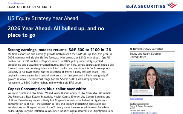 Ключевые выводы включают ожидание, что индекс S&P 500 достигнет 7100 в 2026 году с приростом прибыли на 14%, но с сокращением коэффициента P/E. Прогнозируется умеренный рост цен на акции (~5%). Ожидается снижение выкупа акций и увеличение капитальных затрат (capex). Сектора с повышенным интересом: финансовый, недвижимость, материалы, здравоохранение и энергетика. Ожидается снижение спроса на работников с белыми воротничками из-за автоматизации и ИИ. Текущая ситуация сравнивается с пузырем доткомов 2000 года, но отличается меньшей спекуляцией и поддержкой роста прибыли.